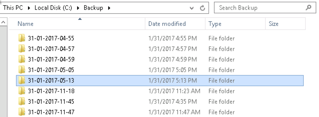 - Creates a new subfolder under c:\backup with the current date and time (dd-MM-yyyy-hh-mm)