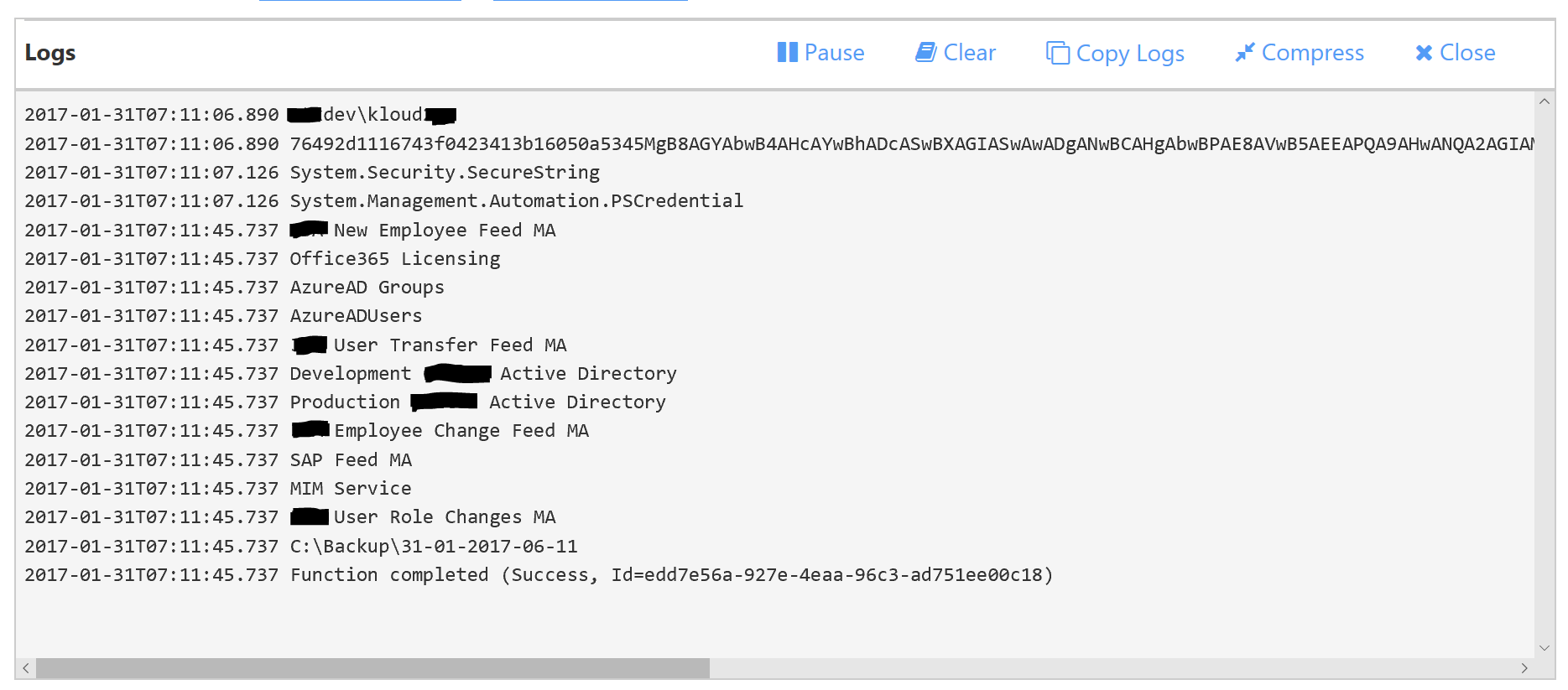 Running the Function App I have limited output but enough to see it run. The first part of the script runs very quick. The Export-FIMConfig is what takes the majority of the time. That said less than a minute to get a nice point in time backup that is auto-magically executed nightly. Sorted.