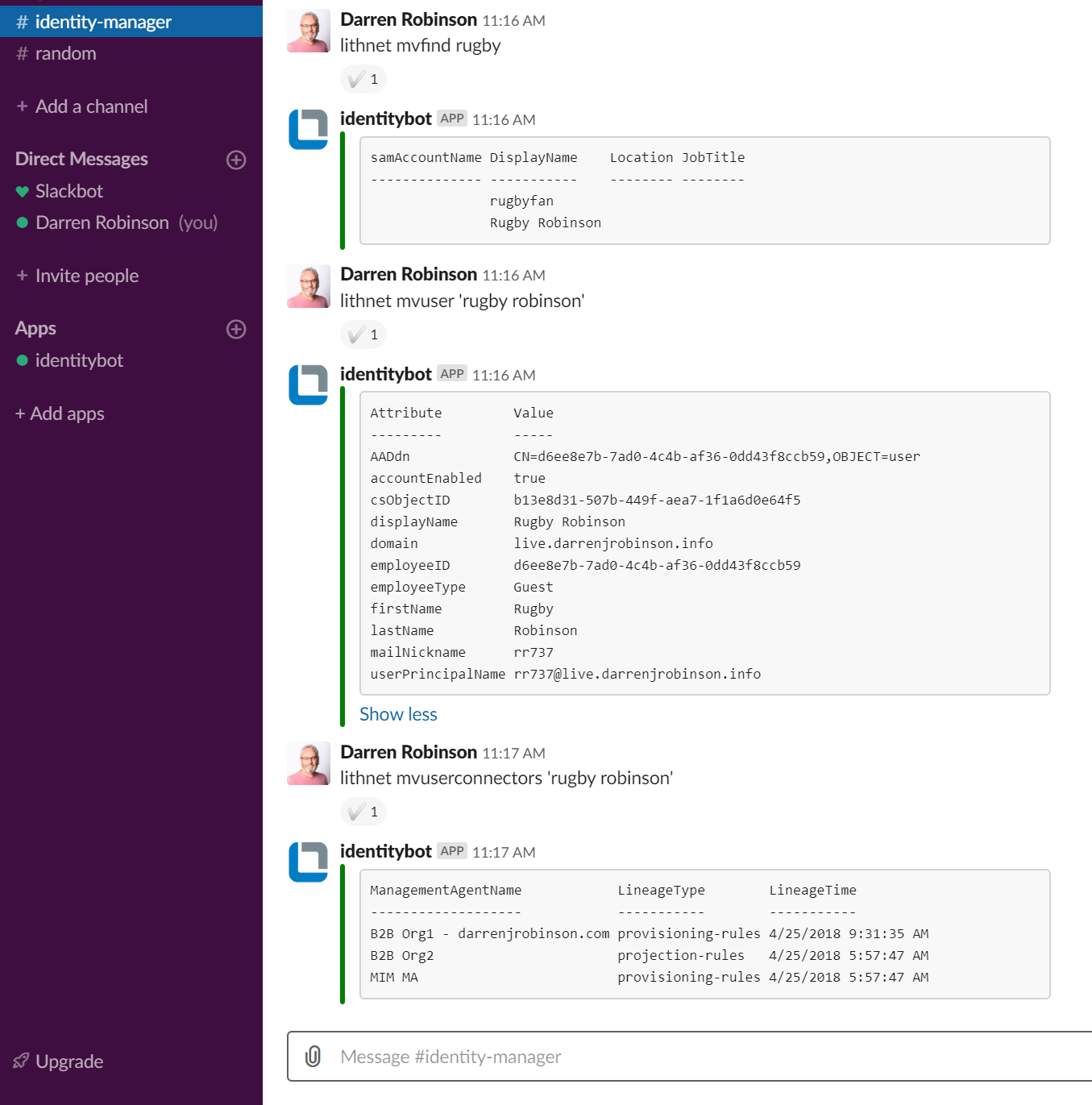 The Lithnet.PoshBot modules leverage the awesome work that Brandon Olin has done with PoshBot and Ryan Newington has done with the Lithnet Tools. If you find this useful please consider a donation (PoshBot, Lithnet) to their open source projects that made ChatOps for Microsoft Identity Manager possible. And let me know how your implementation went via @darrenjrobinson