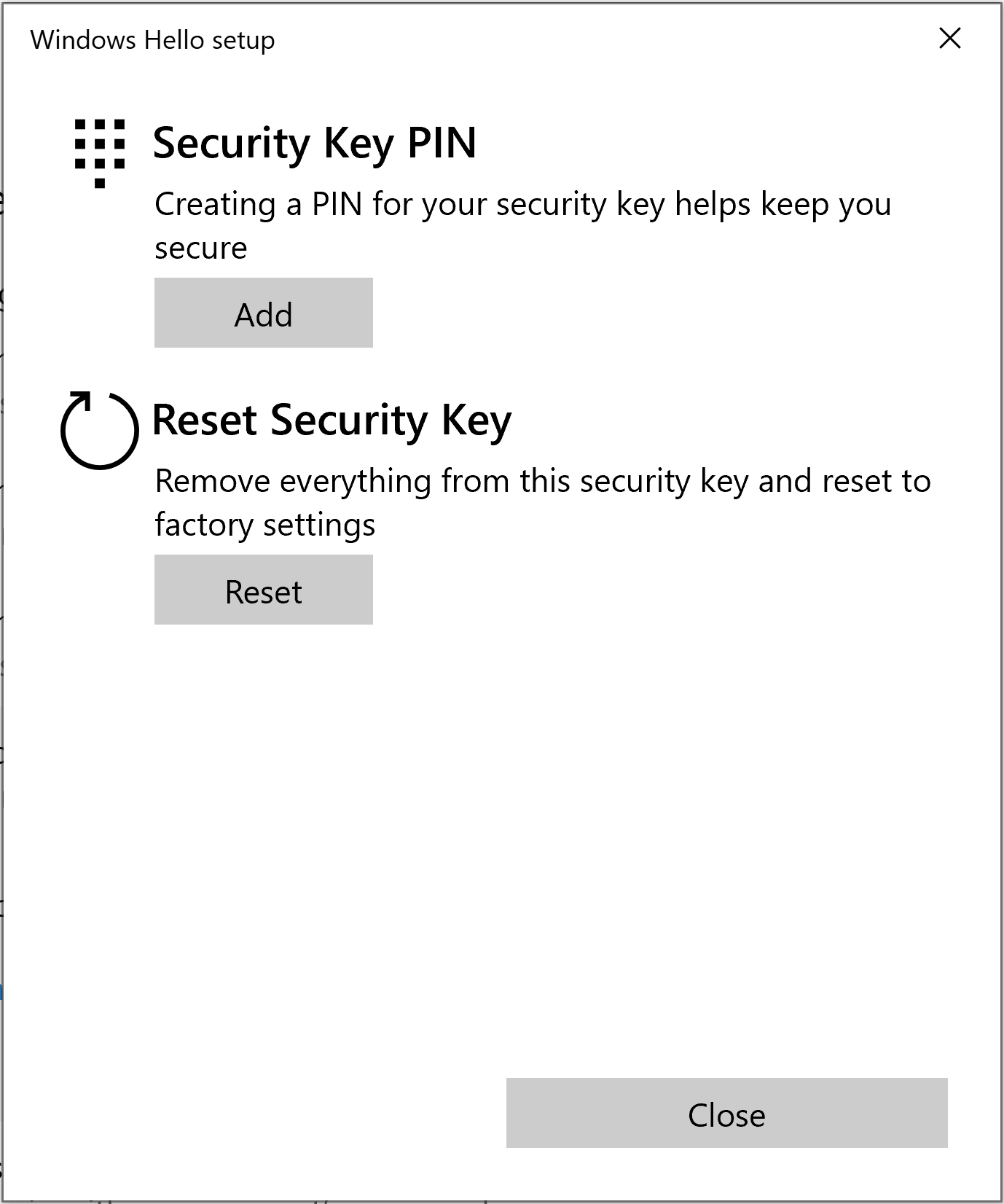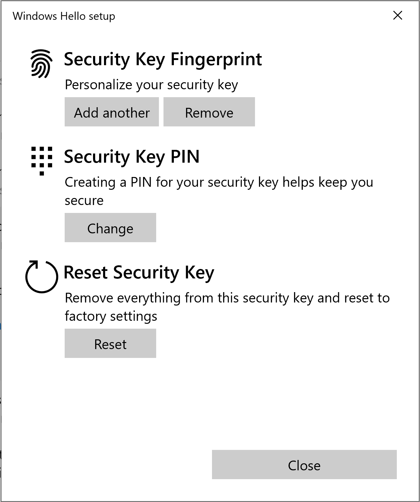 If you got this far, you are on a recent build of Windows 10 (Windows 10 Build 18298 (19H1) or above) and you can manage the key and enrol your finger print(s), set a PIN and reset the key. If you didn’t get this far successfully you will need to install drivers and key management software from the vendor or update your Windows 10 OS.