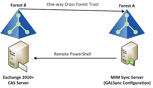 Windows Remote Management (aka Remote PowerShell) is a wonderful thing; when it works straight out of the box when you’re in the same domain. Getting it working across Forests though can feel like jumping through hoop after hoop, and sometimes like the hoops are on fire. When configuring GALSync ([Exchange] Global Address List Synchronisation) with FIM/MIM this always means across AD Forests. The graphic below shows the simplest relationship. If there is a firewall(s) in between then you’ll have additional hoops to jump through.