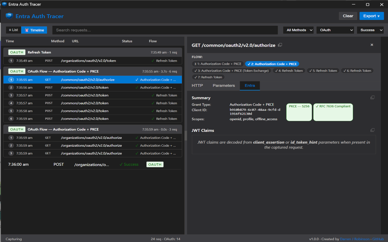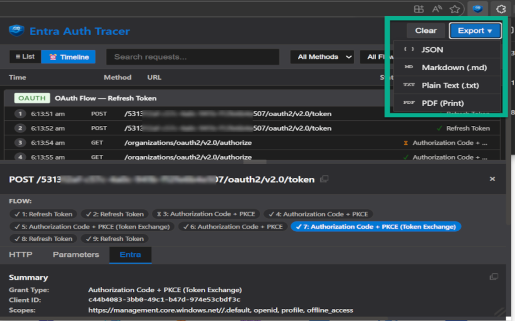 This is probably the most niche but most useful feature for anyone experimenting with Entra Verified ID and developing locally. When building issuance and presentation flows and testing locally the extension captures and decodes the full Verified ID lifecycle: issuance requests, presentation/verification requests, DID document resolution, credential status checks, and OID4VP/OID4VCI flows. It surfaces the credential type, authority, request ID, callback URL, and key warnings such as localhost callback URLs and PIN requirements. Both the Verified ID service calls and the resulting OAuth token exchange will appear in the timeline.
