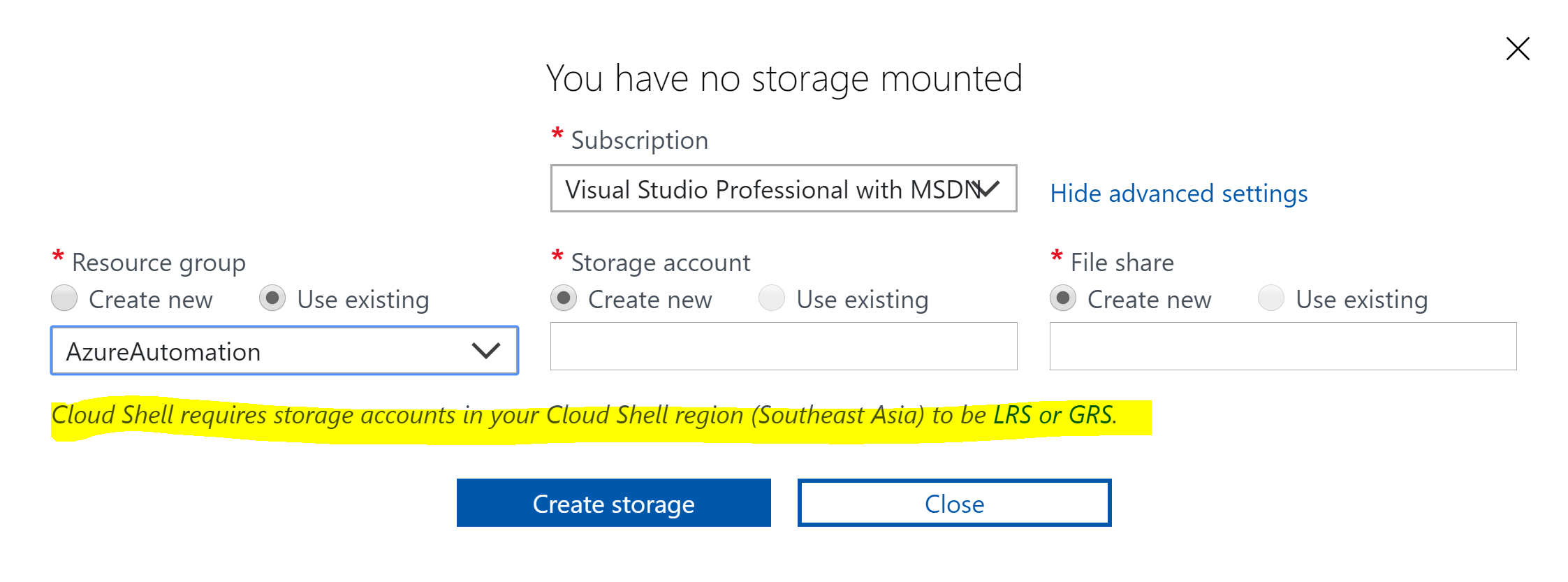 I hit the Advanced Settings to specify creation of a new Resource Group, Storage Account and File Share.