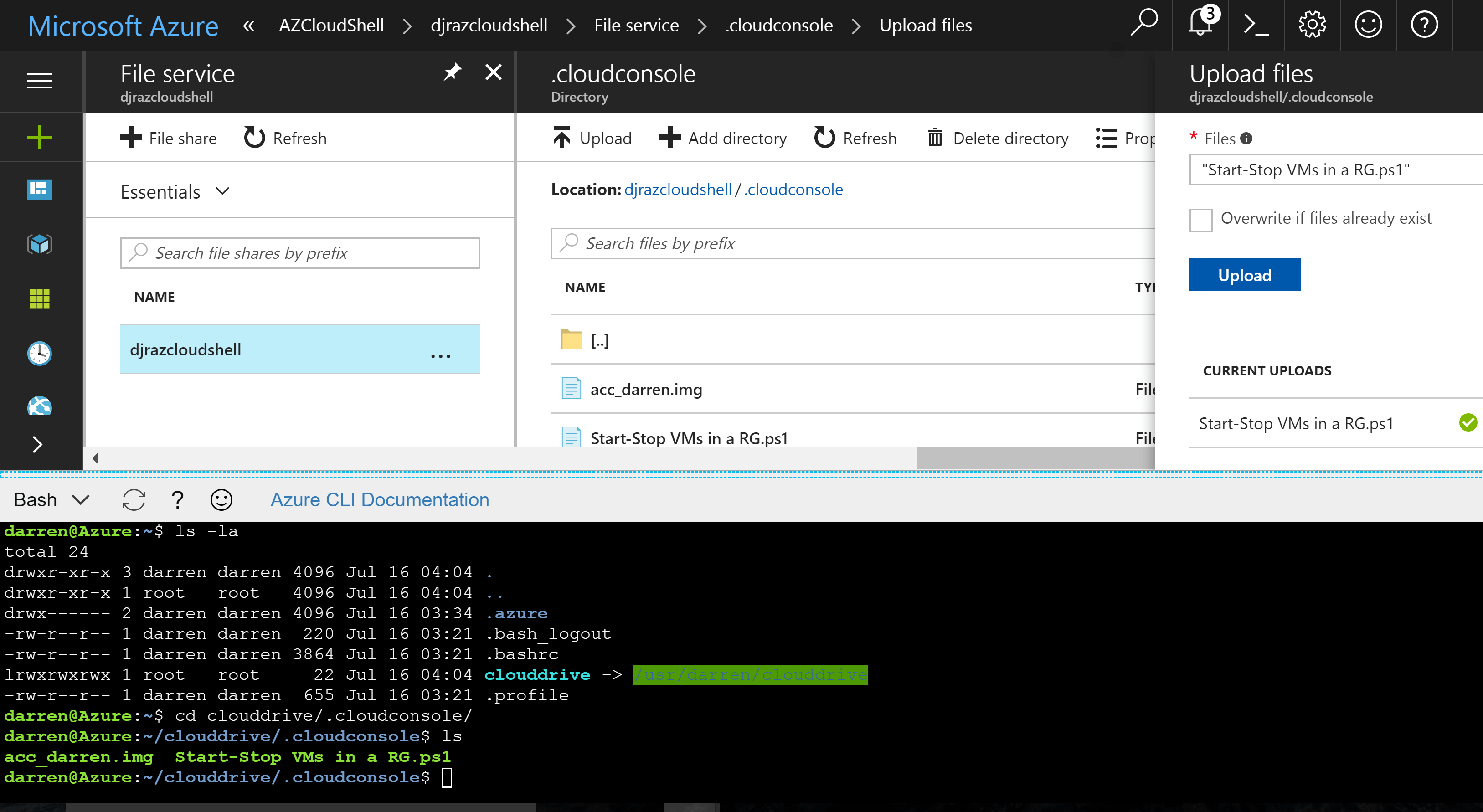 The next thing I looked to do was to put my scripts etc into the clouddrive. I just navigated to the new StorageAccount that I created as part of this and uploaded via the browser.