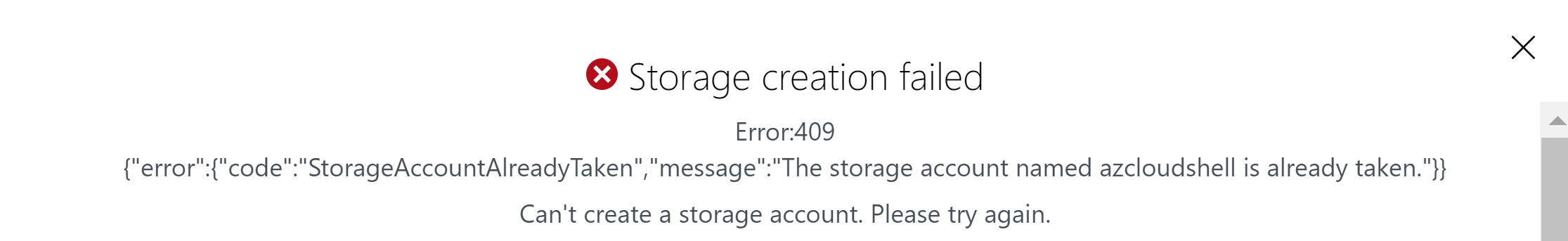 The UI doesn’t check for uniqueness of the configuration settings until it is written. So you might need a couple of attempts with the naming of your storage account. As you can see below it isn’t surprising that my attempt to use azcloudshell as a “Storage Account Name” was already taken.