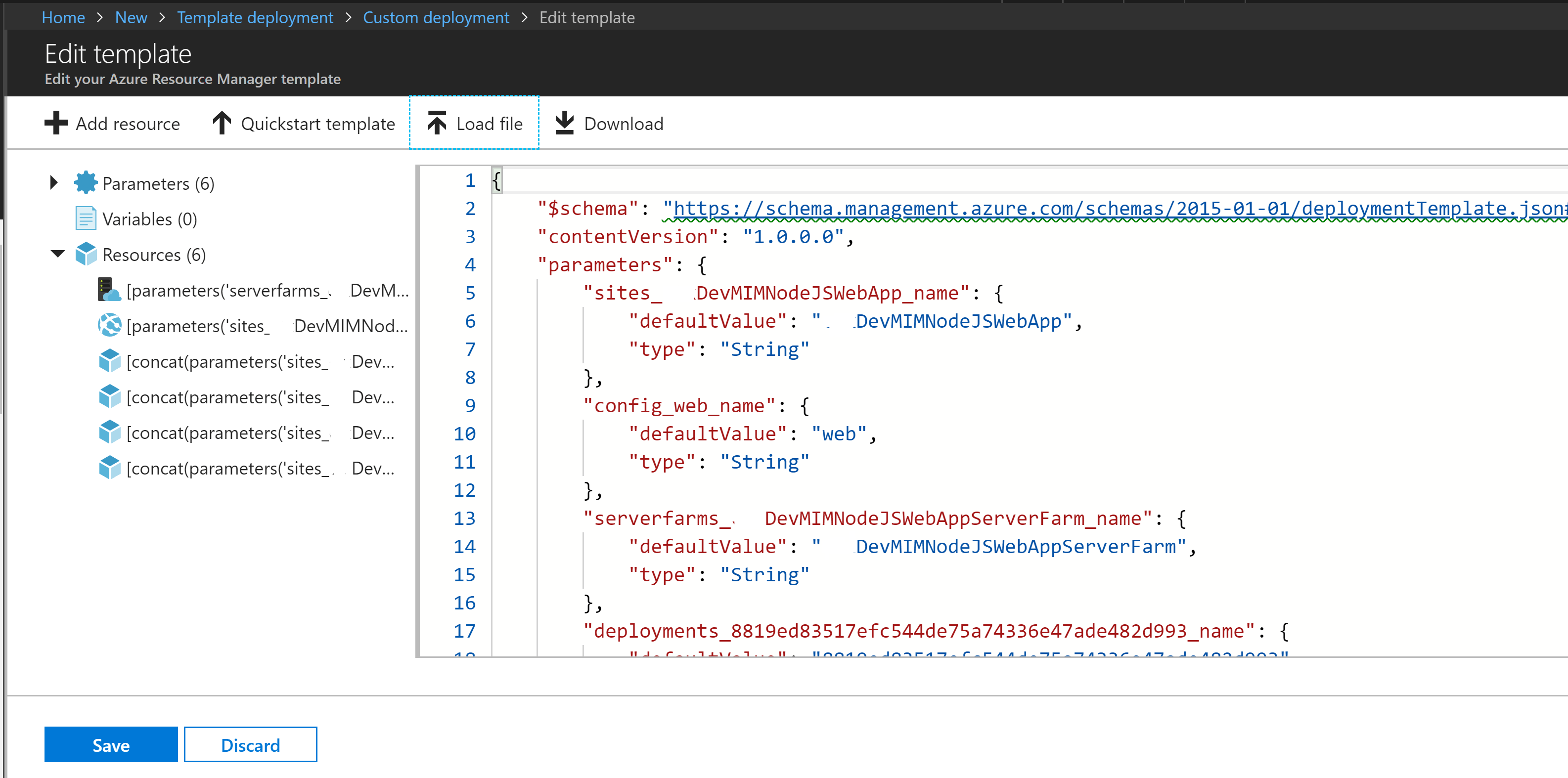In the Azure Portal select Create a Resource from the top of the menu list on the left hand side. Type Template in the search box and select Template Deployment then select Create. Select Build your own template in the editor. Select Load File and select the parameters.json file. Then select Load File again and select the template.json file. Select Save.