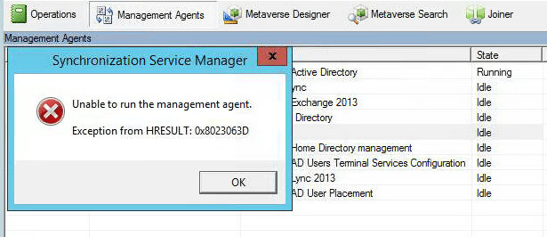 The bug kicks in if you’re trying to run sync sequences on multiple MA’s simultaneously. It throws the error; “Unable to run the management agent.” Exception from HRESULT: 0x8023063D