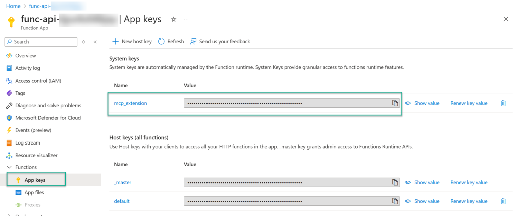 Under API Keys you will see the mcp_extension system key. This is effectively your key to using the Azure Function. This is an example prototype. As the MCP Server Protocol matures I’ll be replacing this with oAuth.