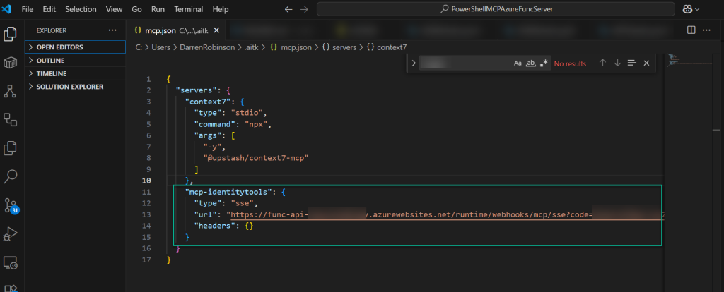 In your MCP Client (e.g. VSCode or Claude) you provide the Azure Function URL and the MCP System Key retrieved from the deployment shown above.