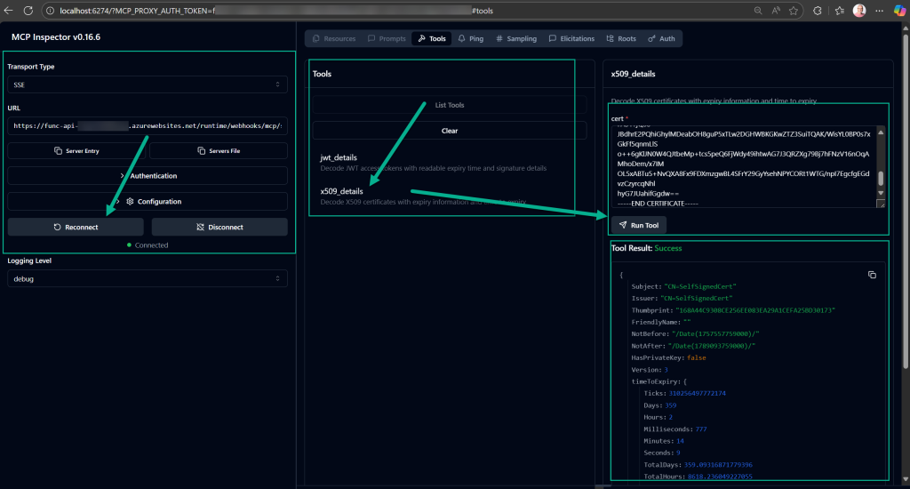 Select SSE and provide the URL with the key https://<functionapp>.azurewebsites.net/runtime/webhooks/mcp/sse?code=<yourMCPKey> then Connect. You will then be able to list the tools exposed via the MCP Server and provide input and run a tool. In the example above I’ve provided a self-signed certificate in pem format for the X509Details PowerShell Module cmdlet which returns the self-signed cert details including time to expiry.
