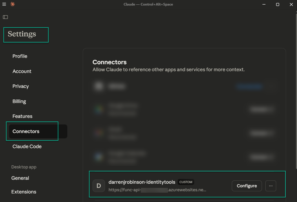 In Claude in Settings Add a Custom Connector. Provide the Azure Function URL and System Key URL https://<functionapp>.azurewebsites.net/runtime/webhooks/mcp/sse?code=<yourMCPKey>