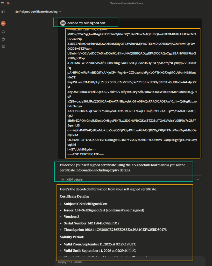 Below is an example of Claude using the PowerShell MCP X509Details PowerShell Module tool and the LLM narrative around the result.