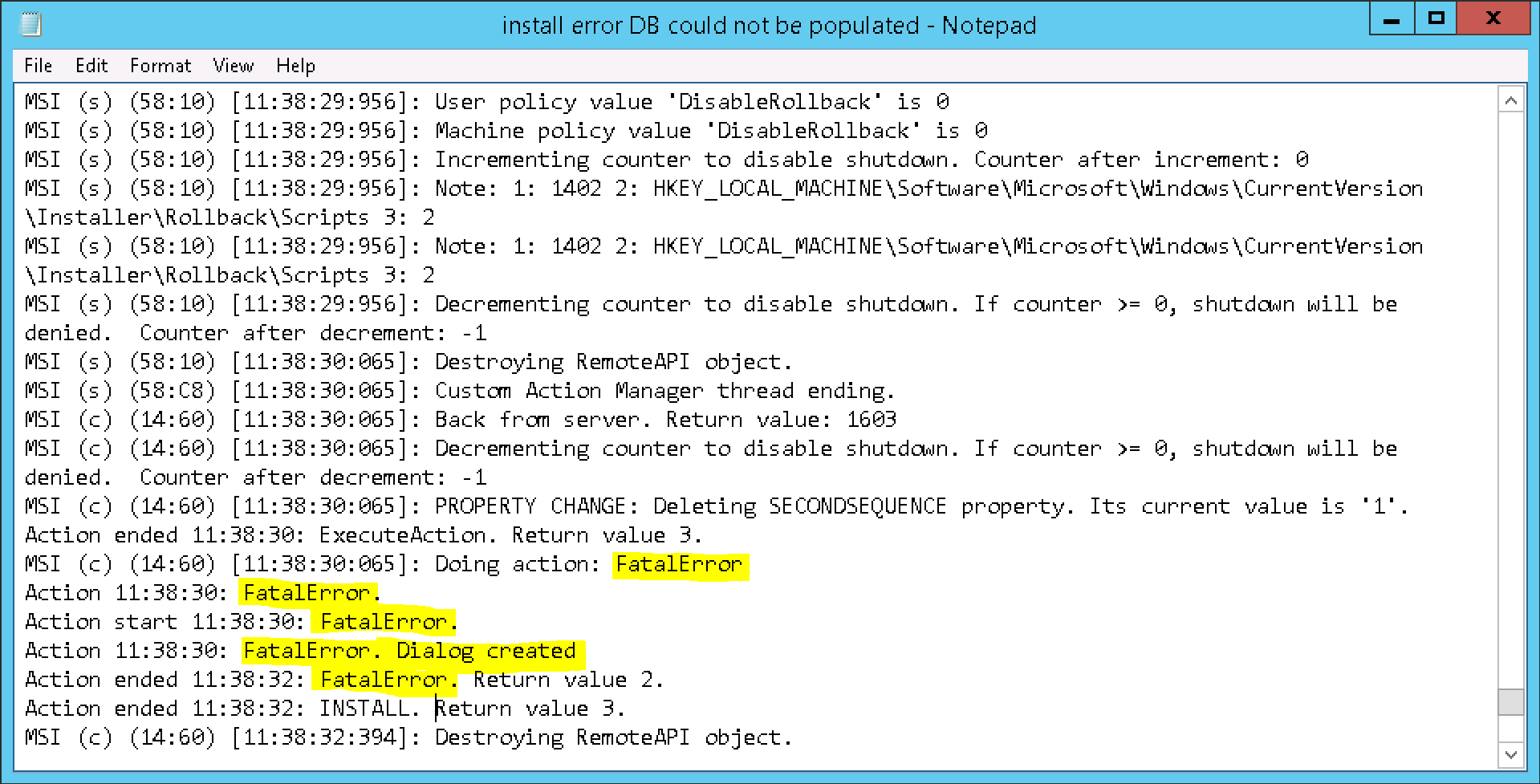 Looking into the installation log (which I’m in the good practice of always initiating when doing an installation of the MIM Service/Portal these days eg. msiexec /i “e:\Service and Portal\Service and Portal.msi” /l*v c:\temp\install.log ) didn’t give up much information at all. Fatal Error. Dialog created.