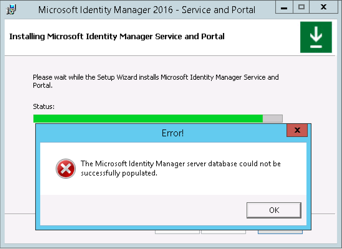 Nearing the end of the Microsoft Identity Manager Service and Portal installation you receive the “The Microsoft Identity Manager server database could not be successfully populated” error.