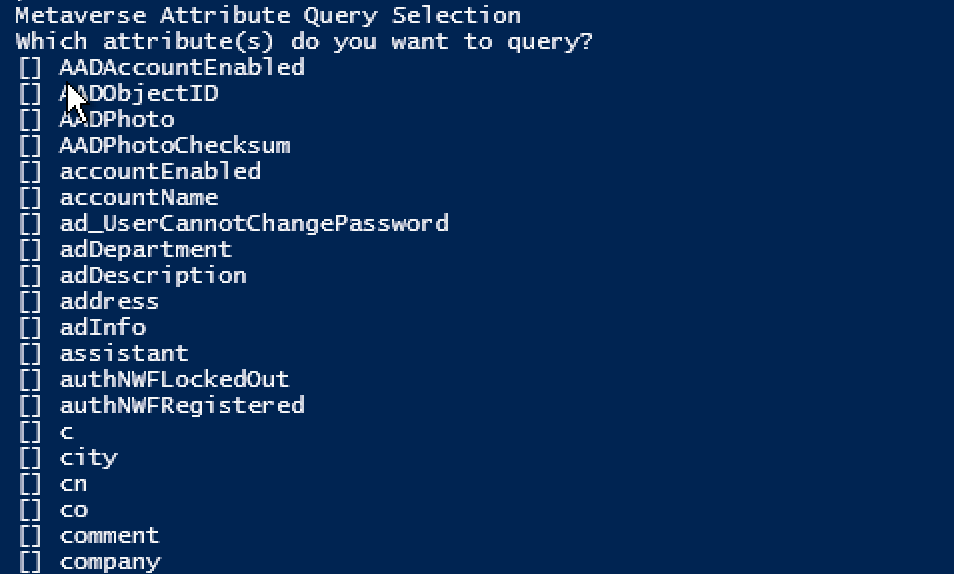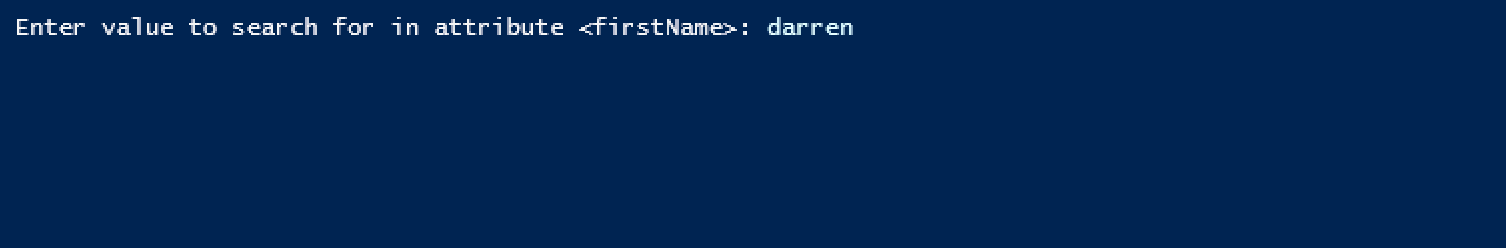 You’ll then be presented with a list of attributes from the chosen Object Class above. Again as detailed above I have it defaulting to ‘accountName’ which is index 5 in my list. Change (Line 77) for the default you want. This means you can just hit enter if accountName is what you’re querying on (which is common). Or choose another option. This then also allows you to also choose multiple attributes (which will be added to an array). This means you can use this for complex queries such as;