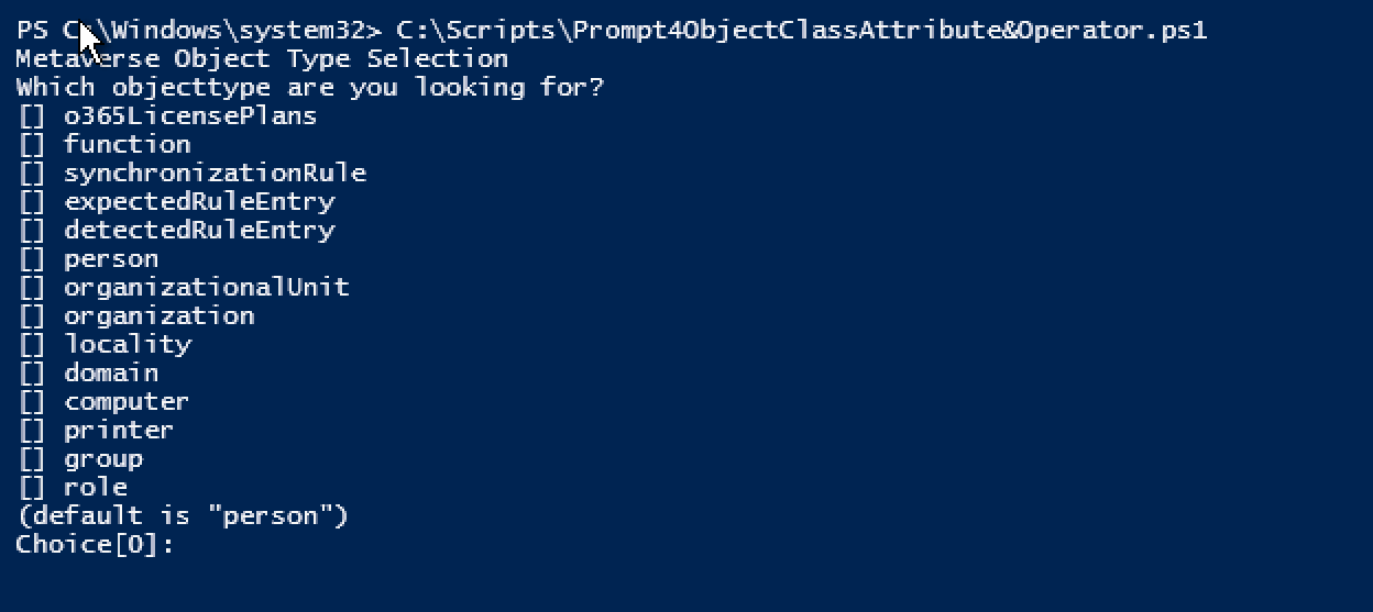 I’ve defaulted the ObjectClass to Person so you can just press enter. But if you have custom ObjectClasses in your Metaverse you may need to change the index number in Line 48 from 5 to whichever index Person appears in your environment. Same goes for the default attribute of AccountName in the Attribute list. It appears at index 5 (Line 77) in my attribute list.