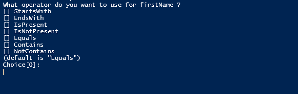 Now for each attribute chosen you will be prompted for an Operator. Pretty simple. Just choose from the available options. Note: all operators are shown but not all operators can be used for all attribute types. e.g. Don’t select ‘EndsWith’ for a Boolean attribute type and expect it to work. If you choose an operator other than the default (equals in my example) hit enter when prompted for the second time and the script will take an empty response as the end of your choices.