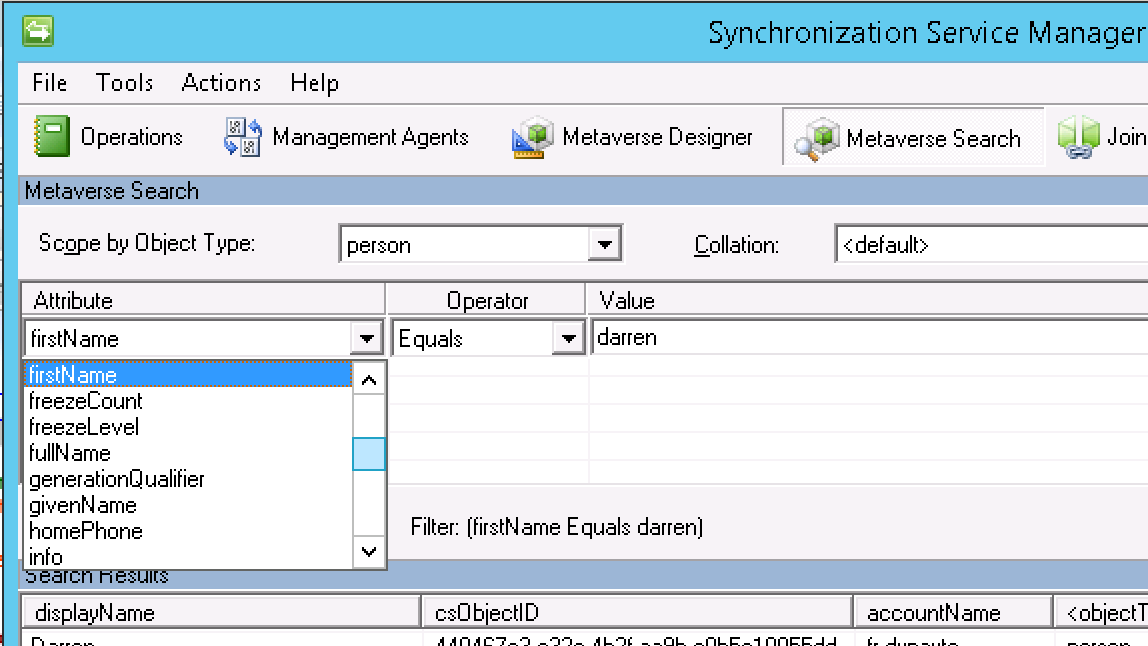 However, sometimes I get tripped up by the differences in Object Classes between the FIM/MIM Service and the Metaverse, the names of the Object Classes (obviously not Person, Group and Contact) and in situations where they are case-sensitive.  If you’re using the Sync Service Manager Metaverse Search function though you get a pick list. But getting the data out to do something else with isn’t an option.
