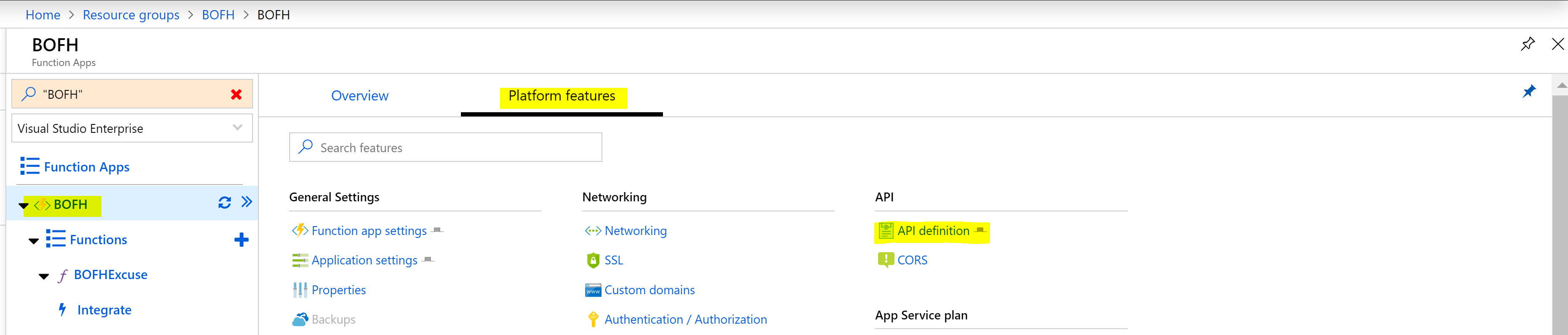 Now it’s time to generate the OpenAPI Spec. Select the Azure Function App => Platform Features => API definition