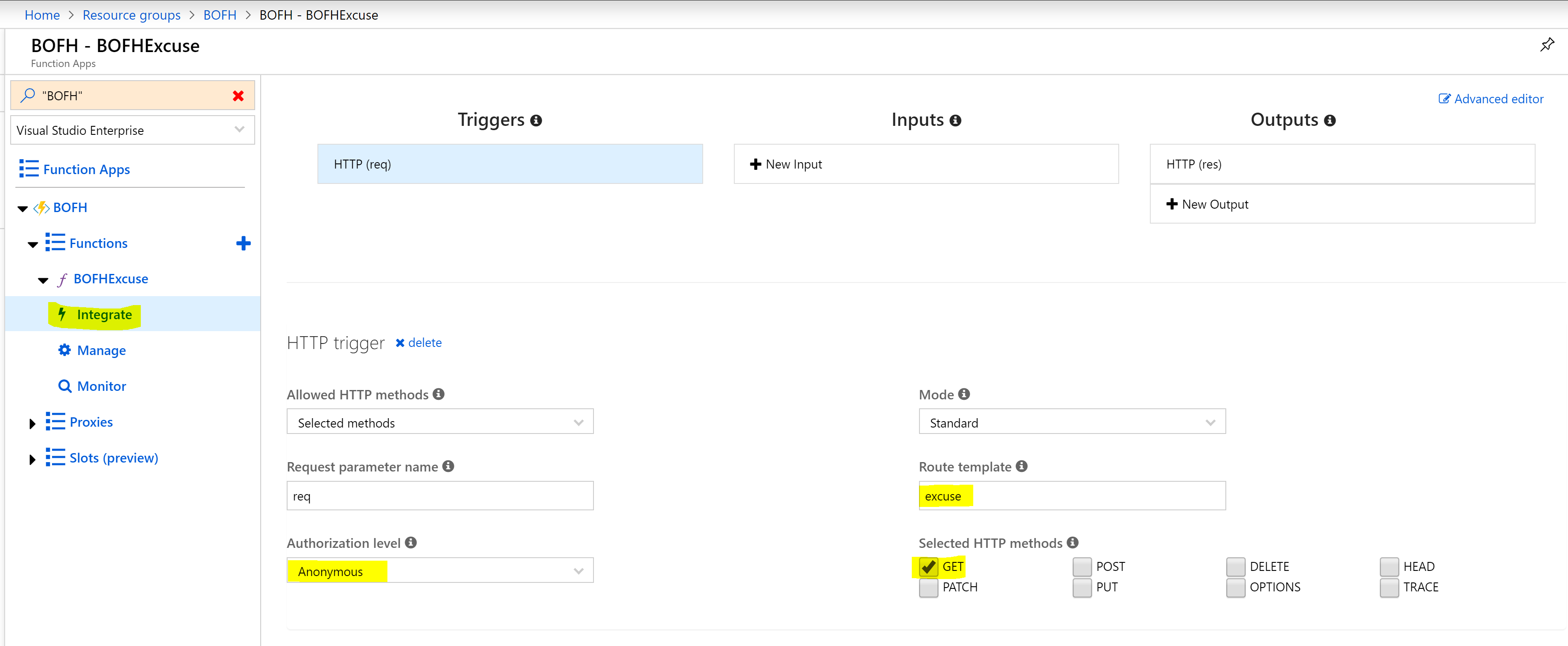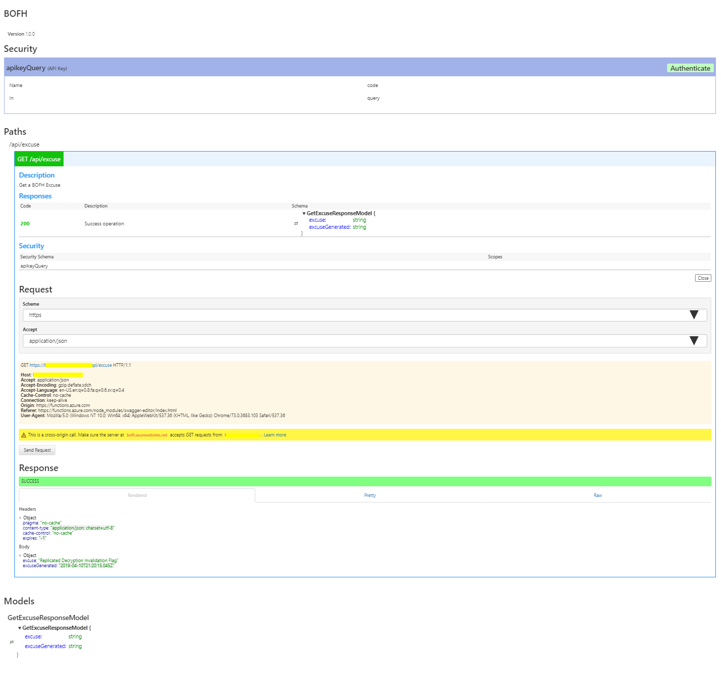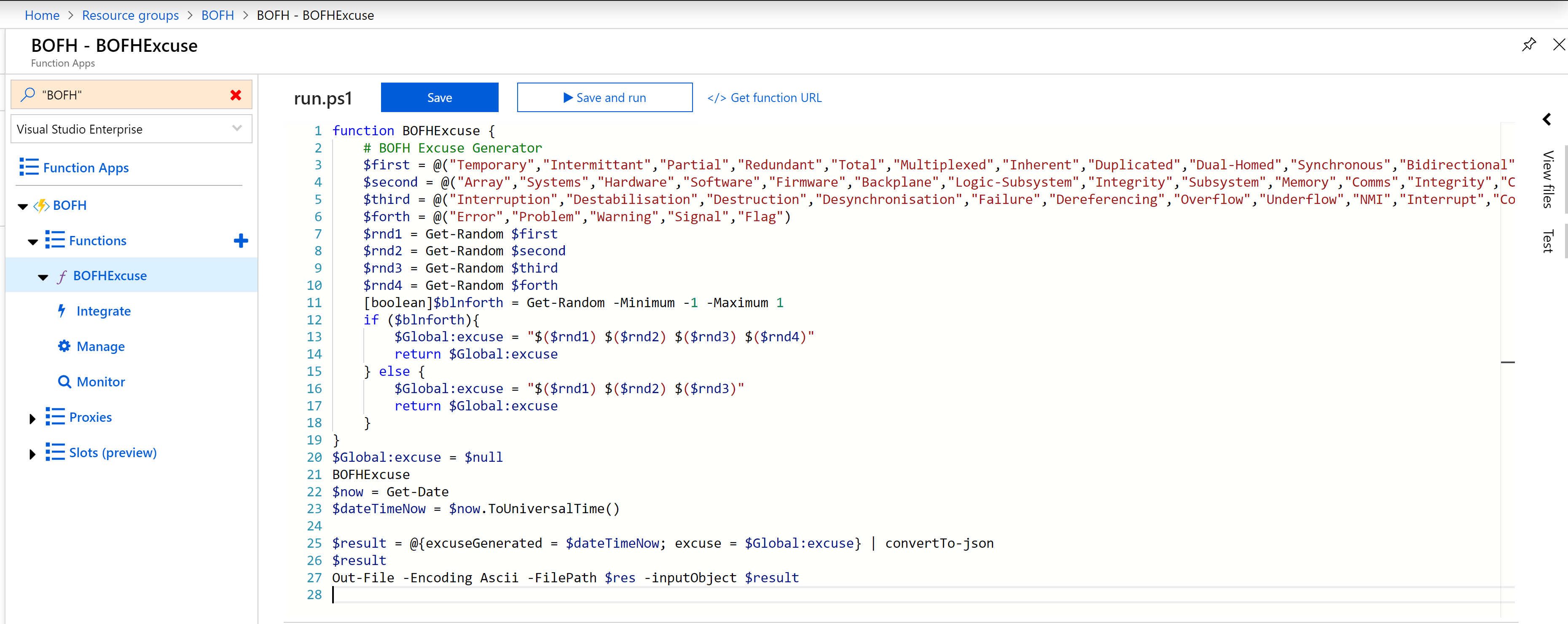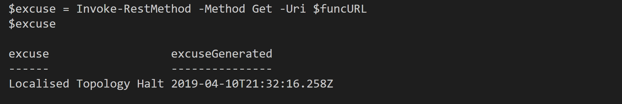 I created an HTTP Trigger based PowerShell API Function that takes GET requests and returns a BOFH – Bastard Operator from Hell (warning link has audio) style excuse. For those that haven’t been in the industry for 20+ years or aren’t familiar with the Bastard Operator from Hell, it is essentially a set of (semi) fictional transcripts of user interactions from a Service Desk Operator (from Hells’) perspective set in a University environment. Part the schtick is an Excuse of the Day. My API when queried returns a semi plausible Excuse of the Day.