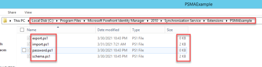 For this example, I have created a folder under the C:\Program Files\Microsoft Forefront Identity Manager\2010\Synchronization Service\Extensions directory name PSMAExample. The PSMAExample folder contains four files. schema.ps1, import.ps1, export.ps1 and password.ps1.