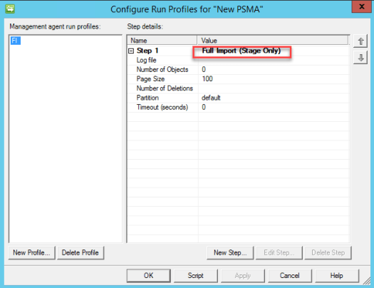 Select your new PowerShell Management Agent and from the Actions menu select Configure Run Profiles. Create a Run Profile for a Full Import (Stage Only).